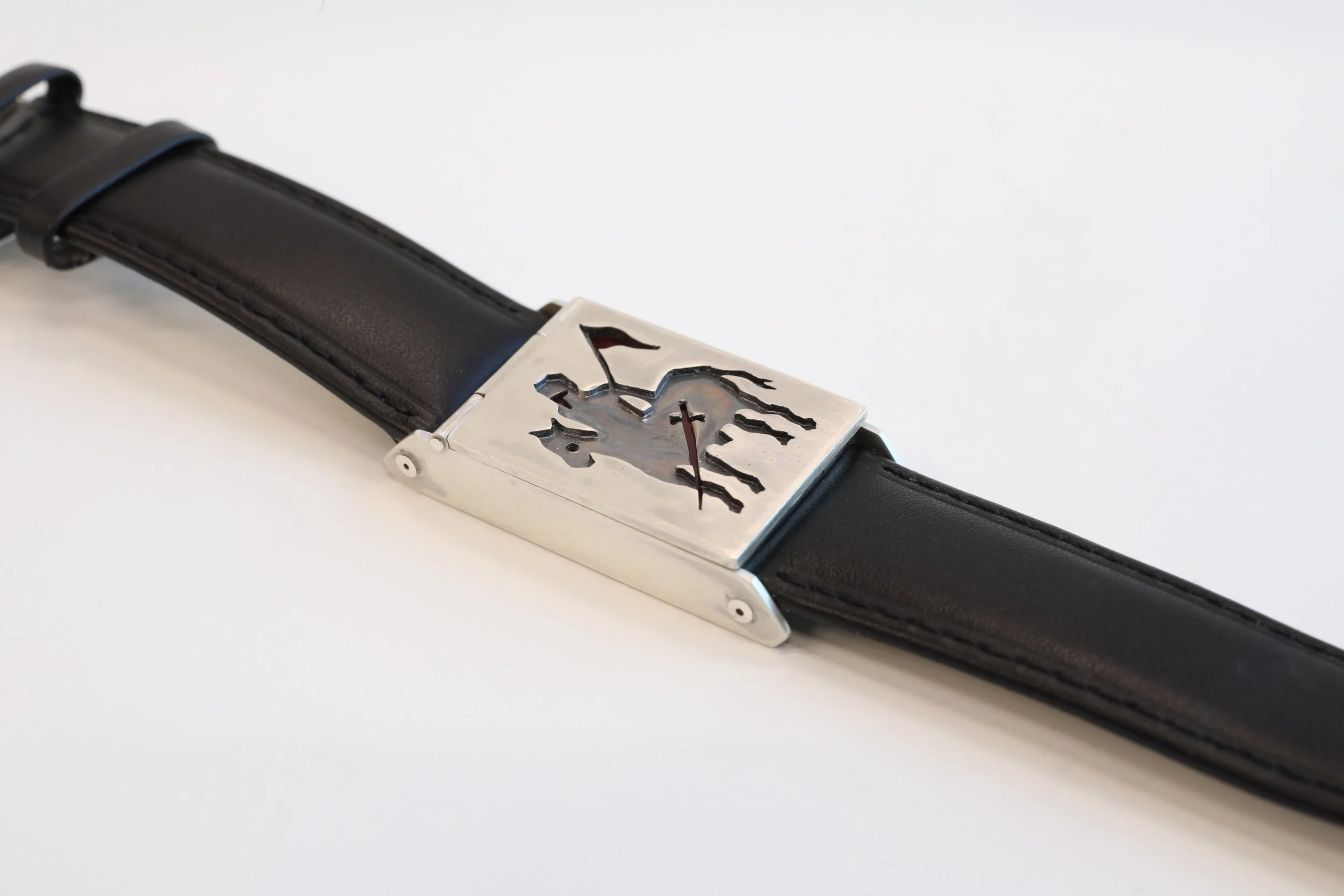Sterling silver, copper, enamel, liver of sulfur patina, leather, 2025